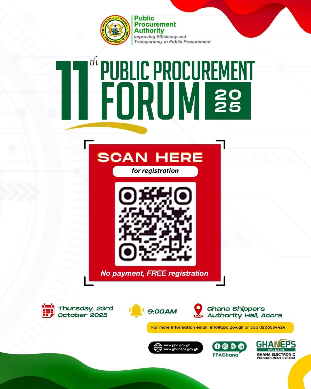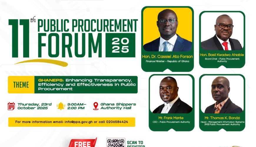 The 2025 Public Procurement Forum will take place on Thursday, 23rd October 2025, at the Ghana Shippers Authority Hall, Accra, commencing promptly at 9:00 a.m. The event will feature a keynote address by the Honourable Minister of Finance, Dr. Cassiel Ato Forson.